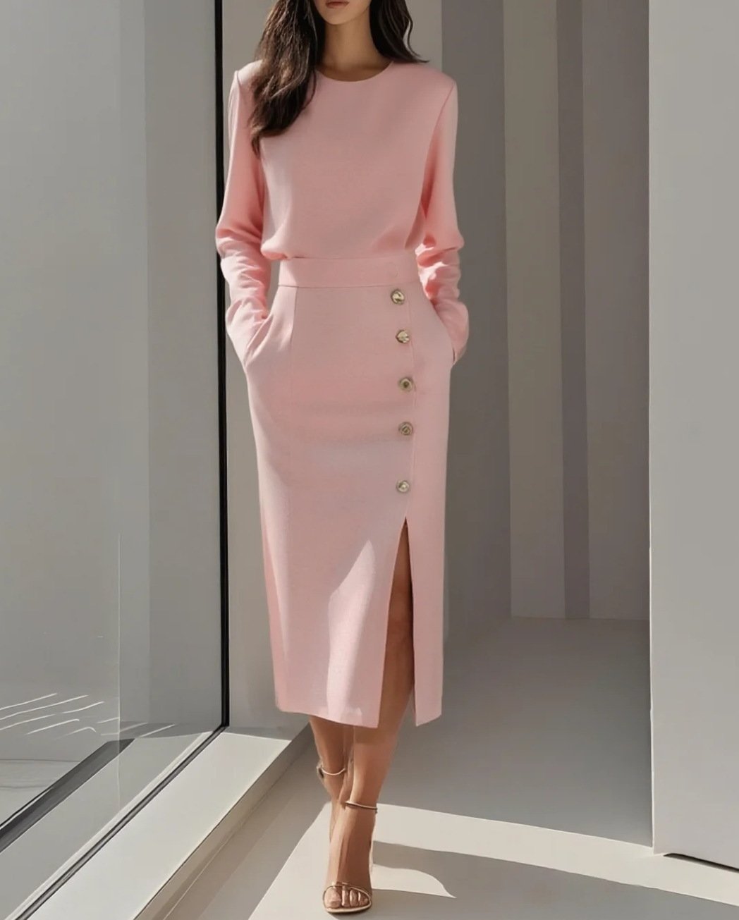 Long-sleeved Round Neck Waist-tie Button-decorated Slit Women’s Dress